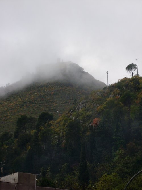The first glimpse of the Abbey is through mist and clouds, perched at the top of the mountain. Impressive, ominous and austere.